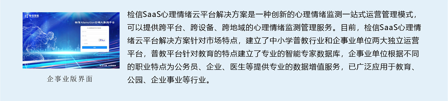 檢信SaaS心理情緒云平臺解決方案是一種創新的心理情緒監測一站式運營管理模式可以提供跨平臺、跨設備、跨地域的心理情緒監測管理服務。目前,檢信SaaS心理情緒云平臺解決方案針對市場特點,建立了中小學普教行業和企事業單位兩大獨立運營平臺,普教平臺針對教育的特點建立了專業的智能專家數據庫,企事業單位根據不同的職業特點為公務員、企業、醫生等提供專業的數據增值服務,已廣泛應用于教育.公園、企業事業等行業。