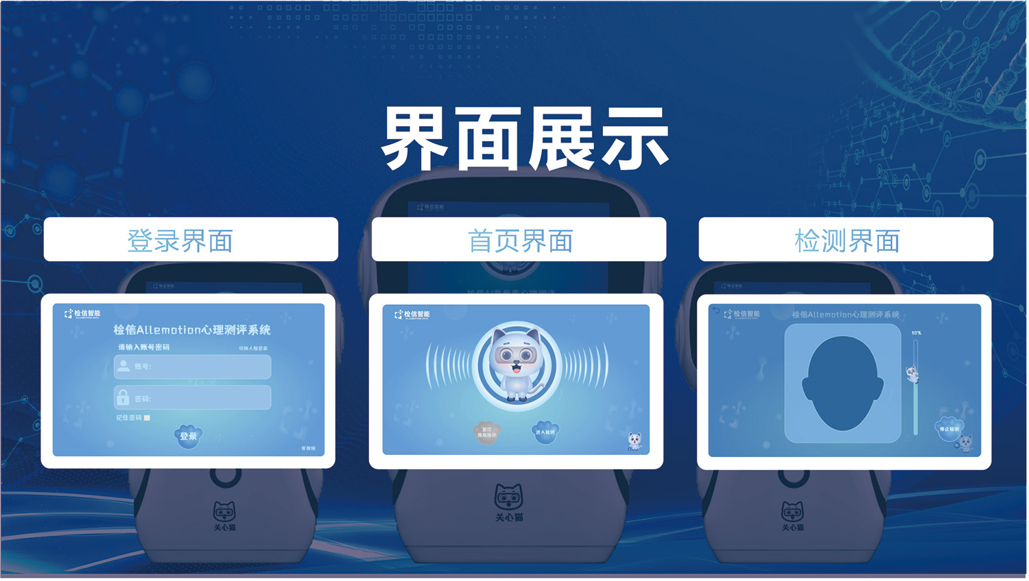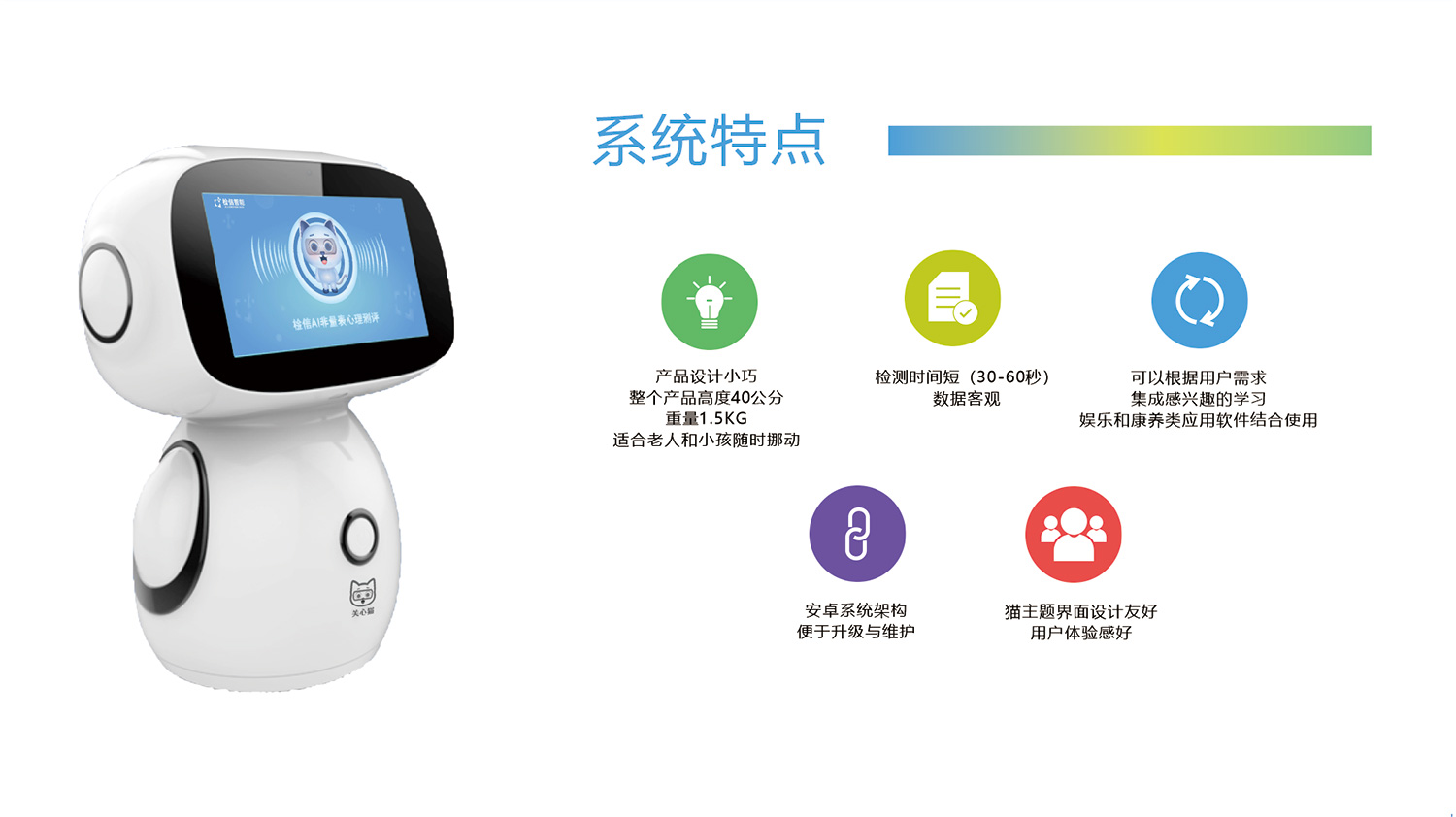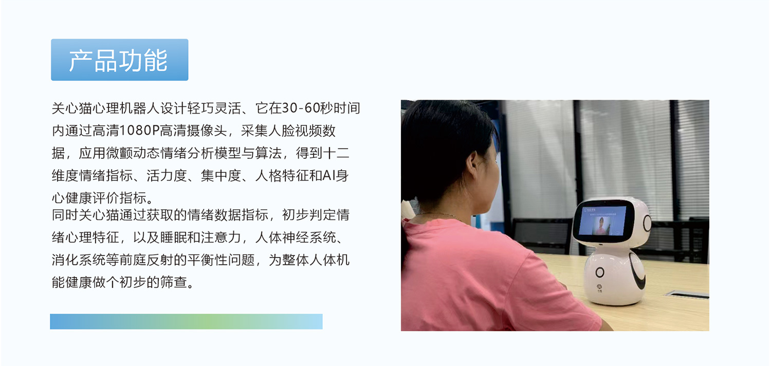 關(guān)心貓心理機(jī)器人設(shè)計(jì)輕巧靈活、它在30-60秒時(shí)間內(nèi)通過高清1080P高清攝像頭,采集人臉視頻數(shù)據(jù),應(yīng)用微顫動(dòng)態(tài)情緒分析模型與算法,得到十二維度情緒指標(biāo)、活力度、集中度、人格特征和AI身心健康評(píng)價(jià)指標(biāo)。