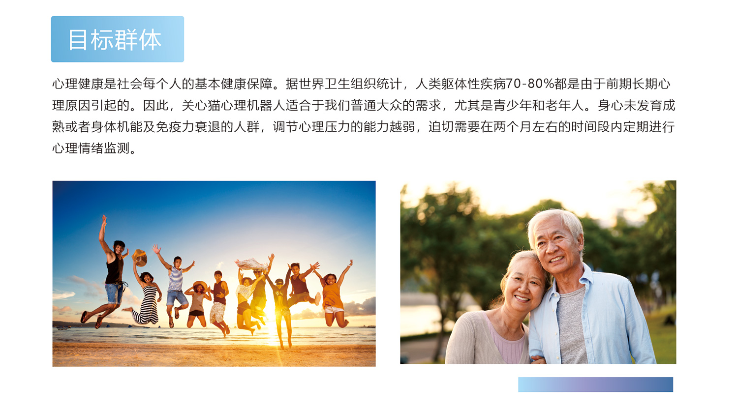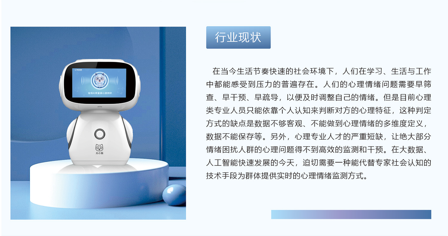 心理健康是社會(huì)每個(gè)人的基本健康保障。據(jù)世界衛(wèi)生組織統(tǒng)計(jì),人類軀體性疾病70-80%都是由于前期長期心理原因引起的。因此,關(guān)心貓心理機(jī)器人適合于我們普通大眾的需求,尤其是青少年和老年人。身心未發(fā)育成熟或者身體機(jī)能及免疫力衰退的人群,調(diào)節(jié)心理壓力的能力越弱,迫切需要在兩個(gè)月左右的時(shí)間段內(nèi)定期進(jìn)行心理情緒監(jiān)測(cè)。