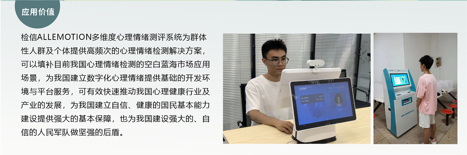 檢信ALLEMOTION多維度心理情緒測評系統為群體性人群及個體提供高頻次的心理情緒檢測解決方案可以填補目前我國心理情緒檢測的空白藍海市場應用場景,為我國建立數字化心理情緒提供基礎的開發環境與平臺服務,可有效快速推動我國心理健康行業及產業的發展,為我國建立自信、健康的國民基本能力建設提供強大的基本保障,也為我國建設強大的、自信的人民軍隊做堅強的后盾。